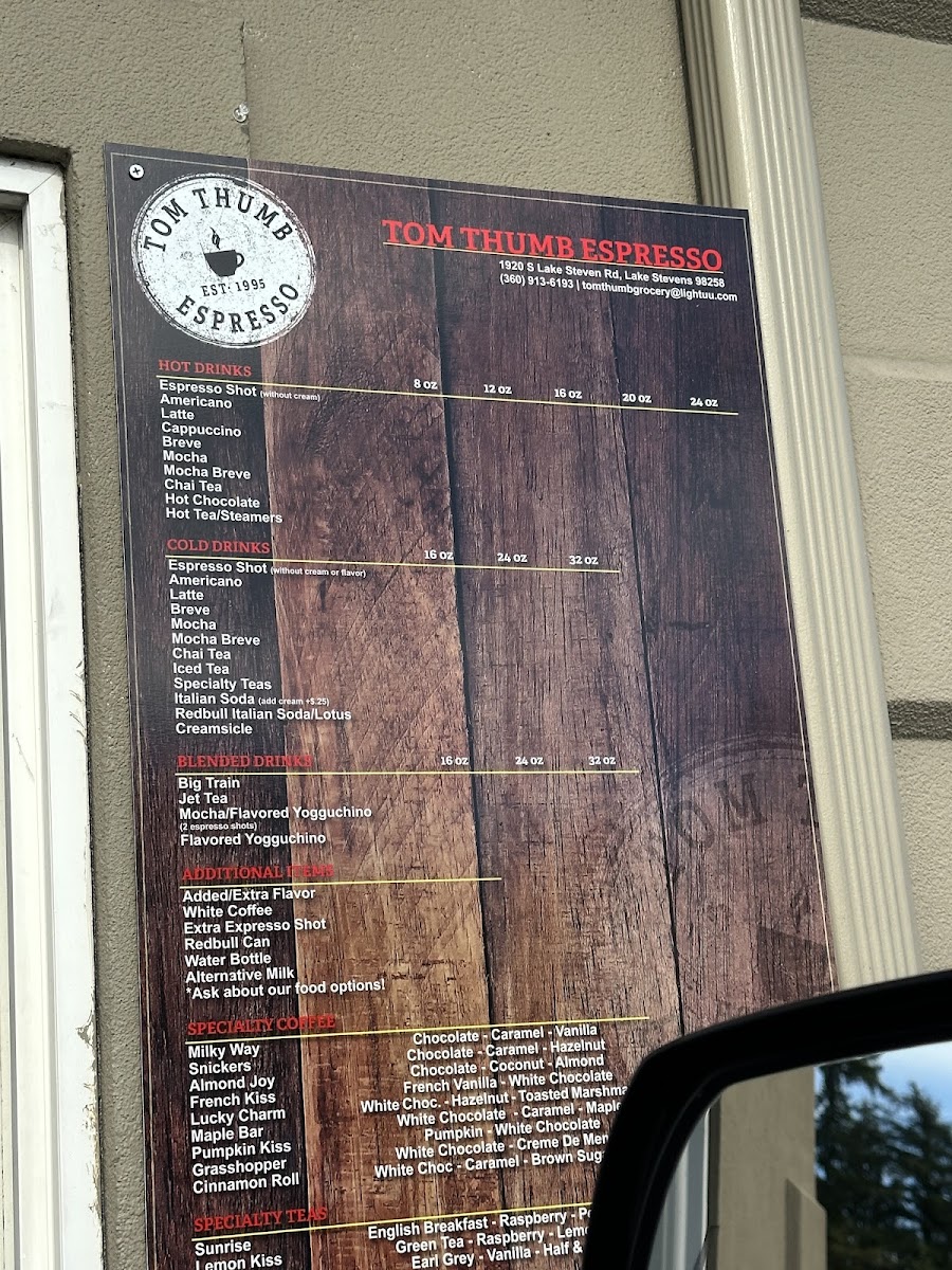If you're in the mood for a cozy spot with great coffee and a menu full of comforting treats, the Tom Thumb Espresso Menu has everything you need. Nestled in the heart of Lake Stevens, WA, at 1920 S Lake Stevens Rd, this place is perfect for anyone looking to enjoy a quick bite or settle in for a longer stay. The menu is packed with a variety of delicious options, from expertly brewed espresso drinks to freshly baked pastries. Whether you’re craving something sweet, savory, or just a warm drink to kickstart your day, there’s plenty to choose from. You’ll find all your go-to classics here, with some unique twists that keep things interesting. If you're nearby, it's the kind of spot you'll want to keep coming back to, thanks to its laid-back vibe and consistently good offerings.